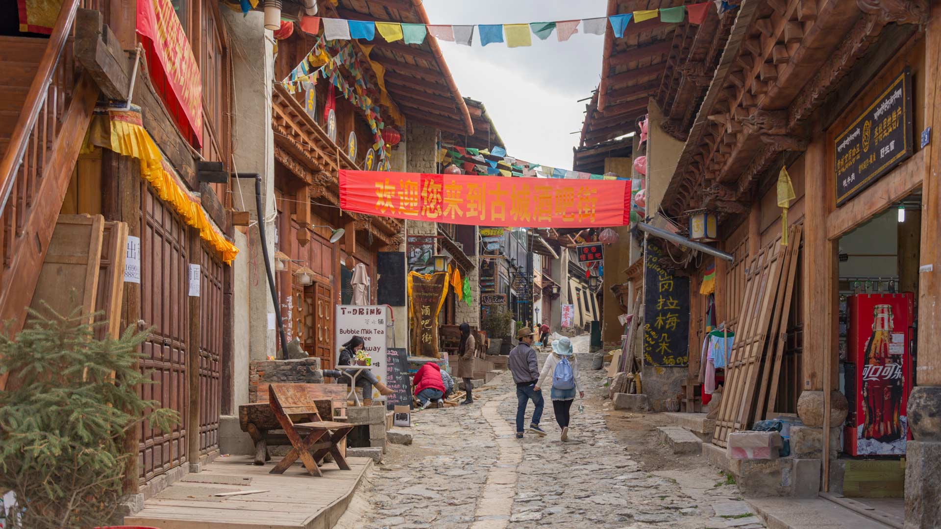 La forma más habitual de llegar a la ciudad es desde Lijiang, las carreteras suben por un cañón que se estrecha poco a poco hasta la meseta donde se alza Shangri-La a más de 3000 metros sobre el nivel del mar, en un entorno privilegiado, la zona fronteriza entre Yunnan, Sichuan y el Tíbet, que está rodeada de montañas heladas y yaks de cola peluda que pastan alrededor. El principal atractivo de esta ciudad es el Monasterio de Jietang Songlin, ubicado al norte. Este templo fue destruido durante la década de 1960, pero actualmente vuelve estar habitado por unos 400 monjes tibetanos.
