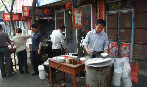 Todos estos manjares se pueden probar en los tenderetes que venden sus productos ya cocinados junto a los mercados y también cerca de las principales paradas de autobús y tren. En ellos se pueden probar además los jiaozi, similares a raviolis, boniatos y patatas asadas, si lo que queremos es un desayuno de comida rápida china.