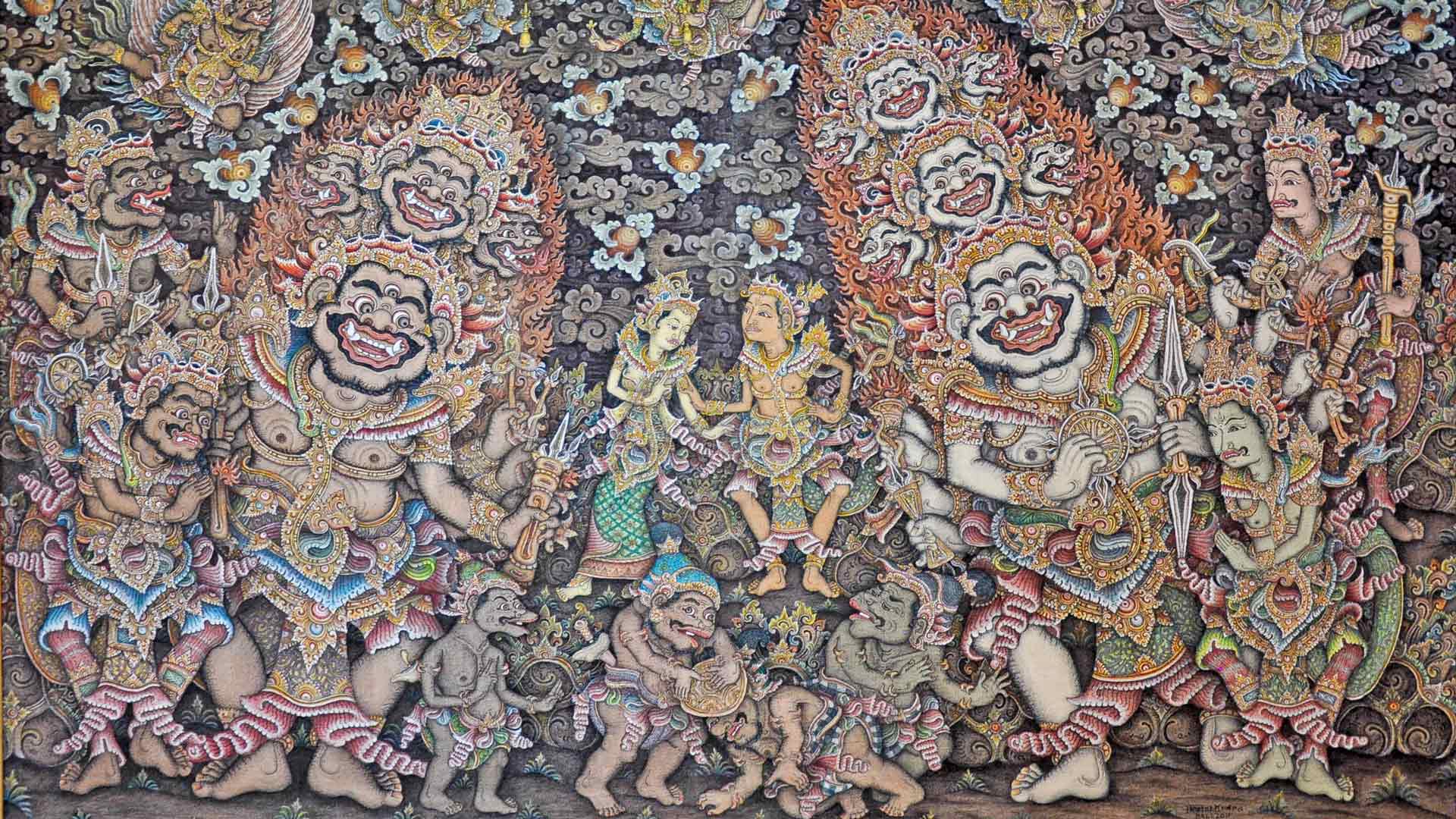Las pinturas varían desde densos dibujos a tinta, cargados de detalle, hasta composiciones luminosas de flores y aves que evocan el ambiente tropical. La diversidad de estilos refleja la riqueza y evolución del arte balinés.