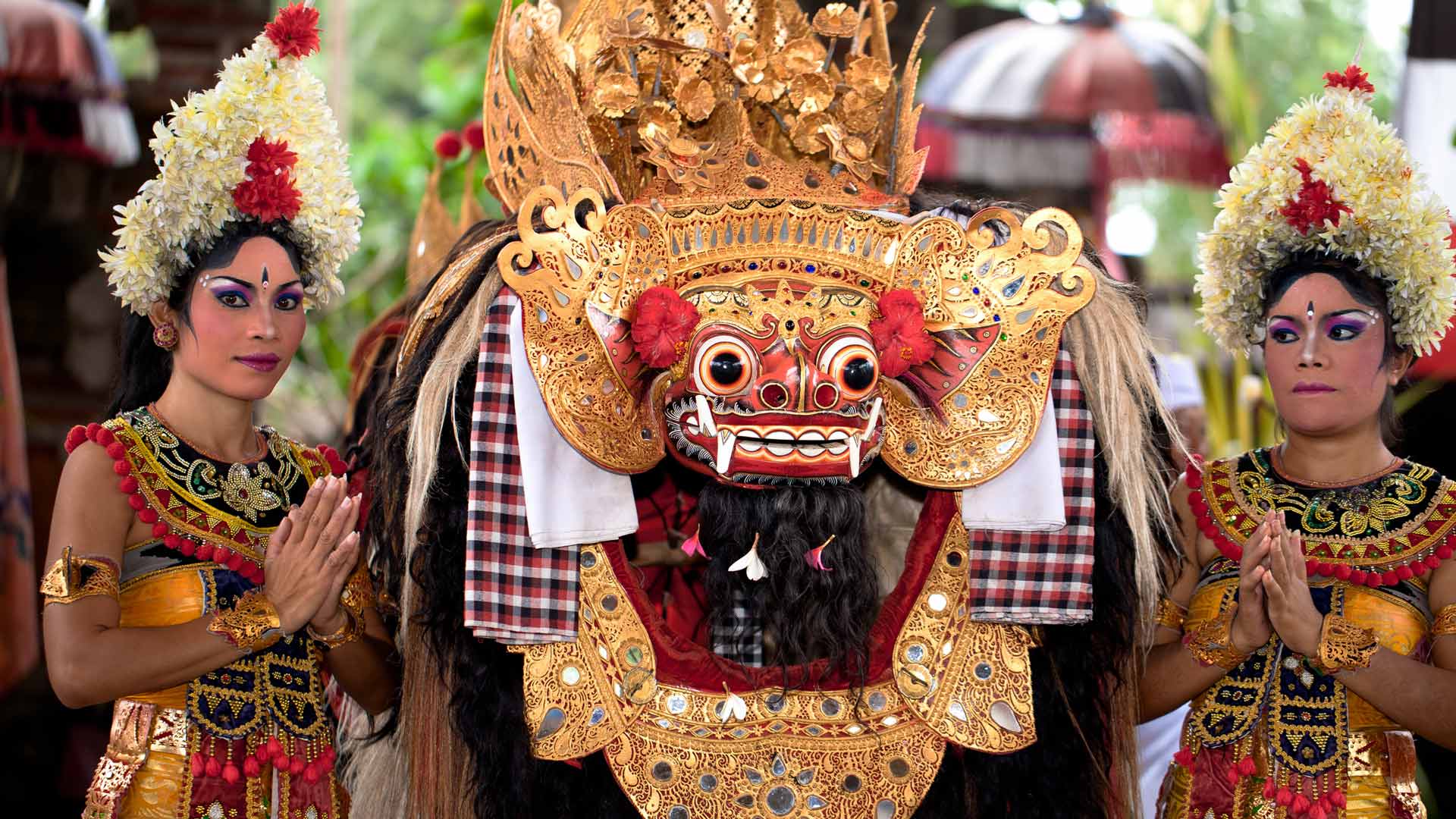 El Barong, con apariencia de león danzante, es un animal sagrado que habita simbólicamente en el bosque. La danza Barong fusiona antiguas creencias indígenas con el hinduismo balinés.