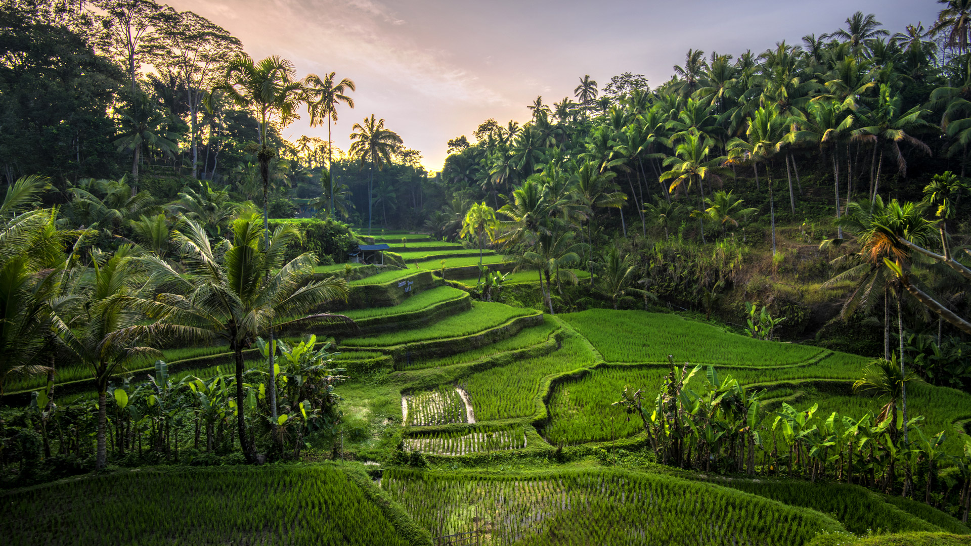 Las famosas terrazas de arroz de Tegallalang se encuentran en dirección a las montañas, al norte de Ubud. El arroz se cosecha tres veces al año, por lo que el paisaje cambia según la estación: desde un verde intenso y joven hasta tonos dorados cuando el grano madura. Es posible acceder a las terrazas y caminar por los senderos que las atraviesan, una forma directa de comprender la relación ancestral entre el pueblo balinés y la tierra.